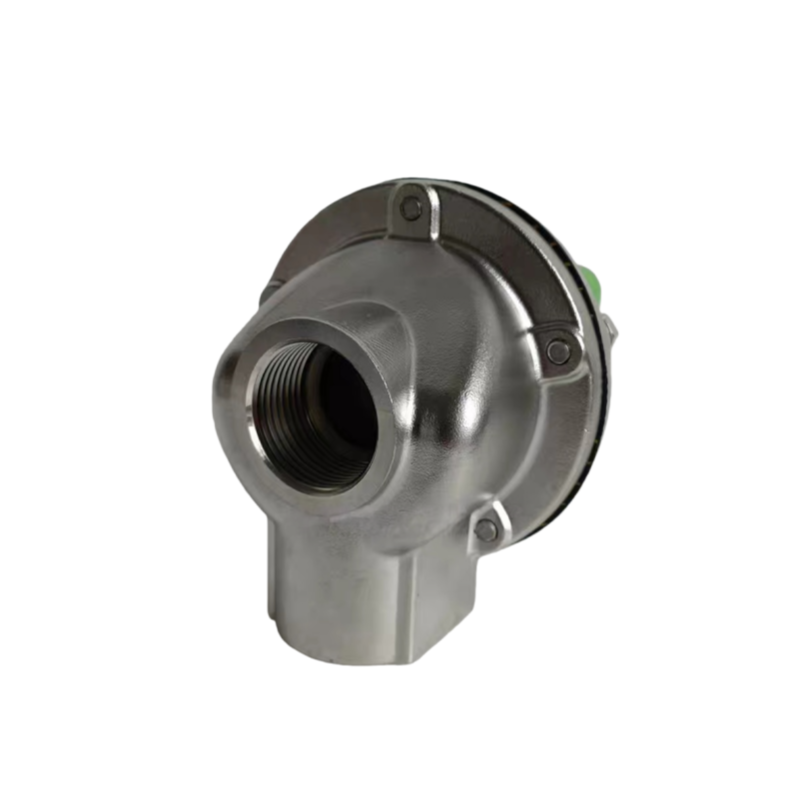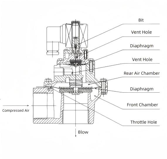 Hinahati ng diaphragm ang electromagnetic pulse valve sa harap at likurang mga silid. Kapag ang compressed air ay ibinibigay sa pamamagitan ng throttle hole papunta sa rear chamber, pinipilit ng rear chamber pressure ang diaphragm na i-seal ang valve outlet, na inilalagay ang electromagnetic pulse valve sa "closed" state. Kapag huminto ang electrical signal mula sa pulse jet controller, nagre-reset ang solenoid valve armature. Ang bentilasyon sa likod ng silid ay nagsasara, at ang tumaas na presyon sa silid sa likuran ay pinipilit ang dayapragm na i-seal ang saksakan ng balbula, na ibabalik ang solenoid valve sa "sarado" na estado. Kinokontrol ng electromagnetic pulse valve ang pagbubukas at pagsasara ng relief port ng valve body sa pamamagitan ng mga electrical signal. Sa panahon ng pagluwag ng balbula, ang naka-pressure na gas sa likurang silid ay inilalabas, habang ang naka-pressure na gas sa harap na silid ay pinipigilan ng vacuum port ng diaphragm, na itinataas ang diaphragm upang simulan ang pagbugso ng pulso. Kapag ang valve body ay huminto sa pag-unload, ang may presyon na gas ay mabilis na pinupuno ang likurang silid sa pamamagitan ng damping orifice. Dahil sa pagkakaiba sa mga lugar na nagdadala ng puwersa sa magkabilang panig ng diaphragm laban sa katawan ng balbula, ang puwersa ng gas sa likurang silid ay nagiging nangingibabaw. Mapagkakatiwalaan nitong isinasara ang diaphragm sa ibabaw ng discharge port ng valve, na pinipigilan ang paglabas ng pulse valve.