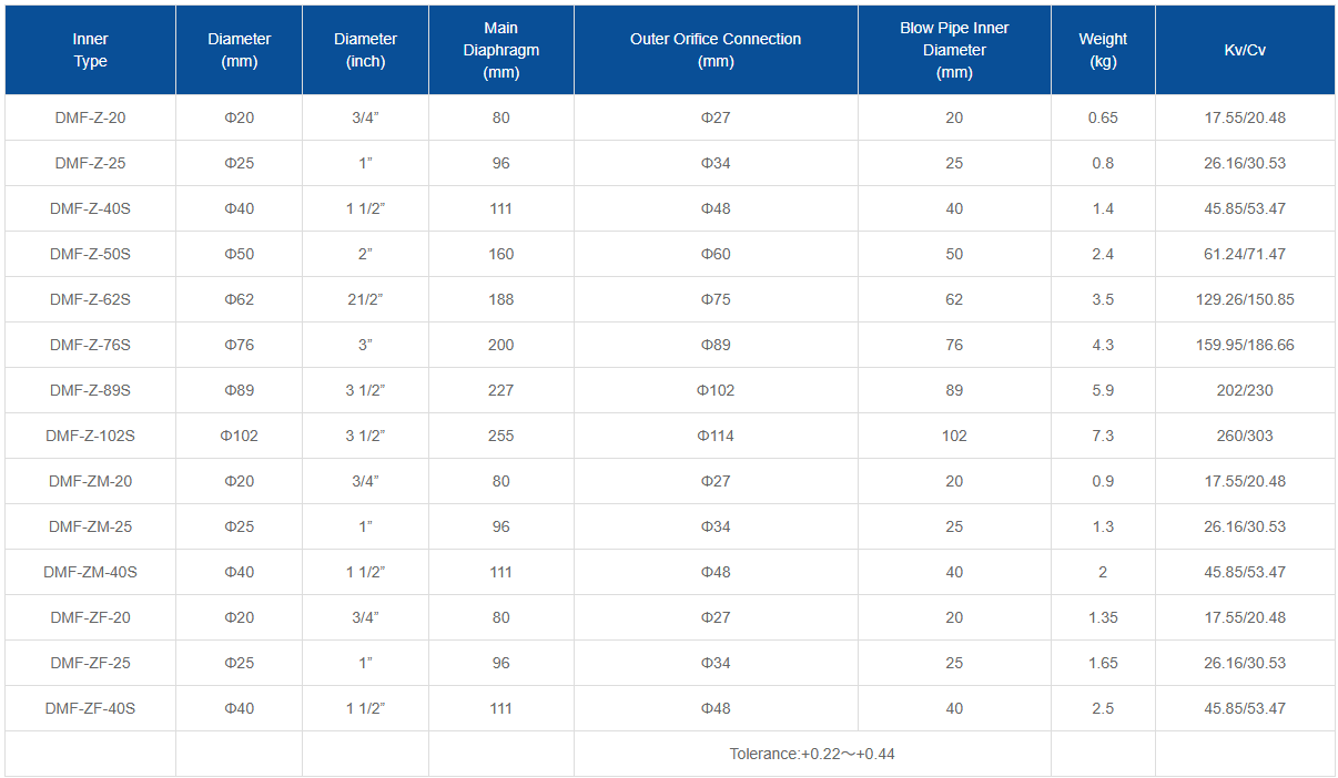 Ang valve body at cover ng DMF-Z right-angle electromagnetic pulse valve ay gawa mula sa die-cast aluminum alloy. Pagkatapos ng paggamot sa ibabaw, nagpapakita sila ng mahusay na paglaban sa kaagnasan. Ang diaphragm at sealing gasket ay vulcanized at composite gamit ang mga bagong proseso. Ang electromagnetic pilot head ay binubuo ng magnetic materials at stainless steel magnetic shielding materials. Ang mga spring at fastener ay gawa sa hindi kinakalawang na asero. Ang air distributor (air chamber) connection pipe at ang dust collector blowpipe ay ipinapasok sa valve inlet at outlet ayon sa pagkakabanggit. Ang magkabilang dulo ay tinatakan sa pamamagitan ng paghigpit ng compression nuts. Available ang mga balbula sa tatlong detalye—20, 25, at 40S—para sa pagpili sa pulse-jet baghouse dust collectors na may iba't ibang air handling (purification) capacities. Ang valve body at cover ay die-cast para sa mataas na density, na may transparent na lacquer coating na nagpapahusay sa corrosion resistance. Gumagamit ang diaphragm seal ng metal-rubber composite para sa mahusay na rigidity at leak-free na pagganap. Ang electromagnetic pilot head ay naghahatid ng malakas na magnetic pull na may tumutugon at maaasahang operasyon. Ang balbula ay nagpapakita ng higit na mahusay na pagganap ng pagbubukas, na nagbubukas nang mapagkakatiwalaan sa 85% ng rated boltahe. Nagpapakita rin ito ng mahusay na pagganap ng pagsasara, mapagkakatiwalaan na nagse-sealing sa 0.15 MPa air pressure.